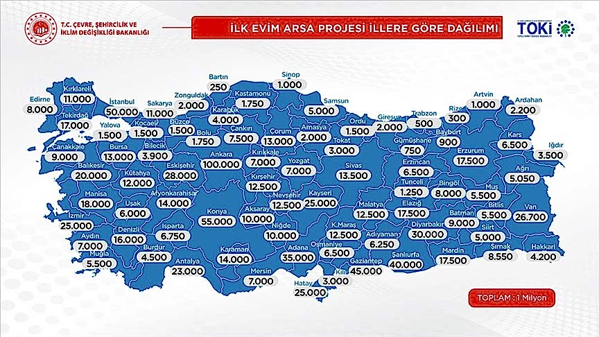 Çevre, Şehircilik ve İklim Değişikliği Bakanı Murat Kurum, Bakanlık ve TOKİ eliyle hayata geçirilen Cumhuriyet tarihinin en büyük sosyal konut hamlesi “İlk Evim, İlk İş Yerim” projesinde yer alan 1 milyon konut arsası kura çekimlerinin 1 Şubat 2023 Çarşamba günü başlayacağını duyurdu. Bakan Kurum, resmî sosyal medya hesabından yaptığı paylaşımda, “İlk Evim projemizle 85 günde 71 ilimizde 182 bin 599 yuvamızın sahibini belirledik. Şimdi sırada arsalarımız var. Altyapısı hazır 1 milyon arsamızın kuralarını çekmeye yarın başlıyoruz. Hayırlı olsun.” ifadelerini kullandı. “İlk Evim Arsa” 1’nci etap kuraları 1-6 Şubat 2023 tarihleri arasında 13 ilde noter huzurunda gerçekleştirilecek.